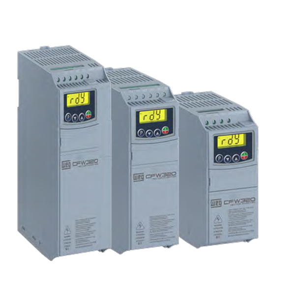 The CFW320 is a high-performance variable-speed drive for three-phase induction motors. It is ideal for machines or equipment applications requiring precise control with easy setup and operation. The CFW320 features a compact size with contactor-style electrical connections (top in / bottom out). The VFD’s performance can be scaled to match the application by selecting WEG vector control (VVW) or scalar control (V/F). The CFW320 includes a built-in operator interface (HMI) and SoftPLC with free WPS programming software for custom-tailored control schemes. A variety of plug-in option modules for additional I/O and communications protocols may be added to provide extended capabilities, making the CFW320 a flexible and cost-effective solution for your variable speed requirements.